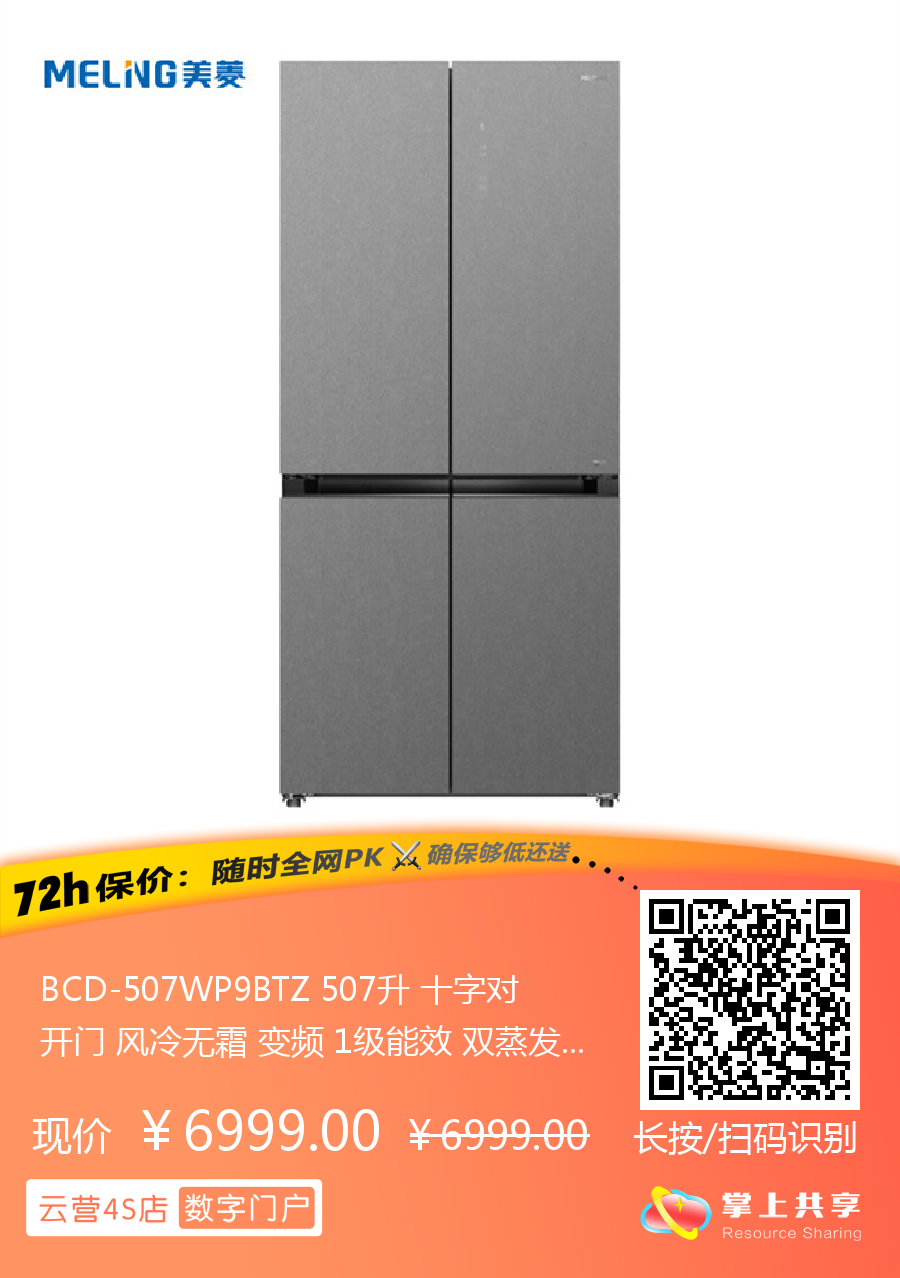 BCD-507WP9BTZ 507升 十字对开门 风冷无霜 变频 1级能效 双蒸发器系统 零平嵌 美菱(MeiLing)