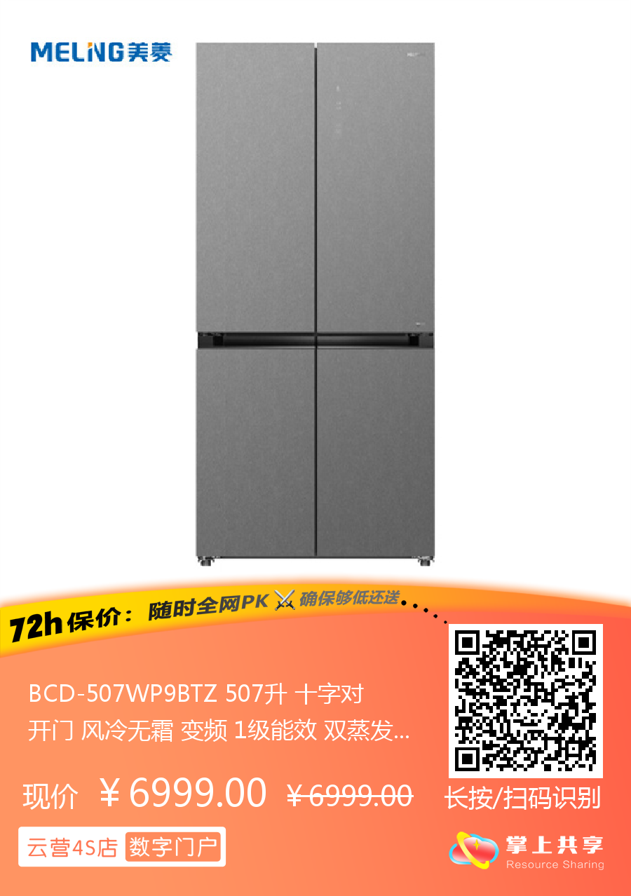 BCD-507WP9BTZ 507升 十字对开门 风冷无霜 变频 1级能效 双蒸发器系统 零平嵌 美菱(MeiLing)