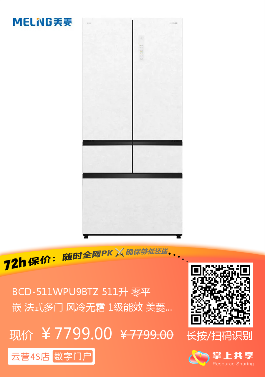 BCD-511WPU9BTZ 511升 零平嵌 法式多门 风冷无霜 1级能效 美菱(MeiLing)