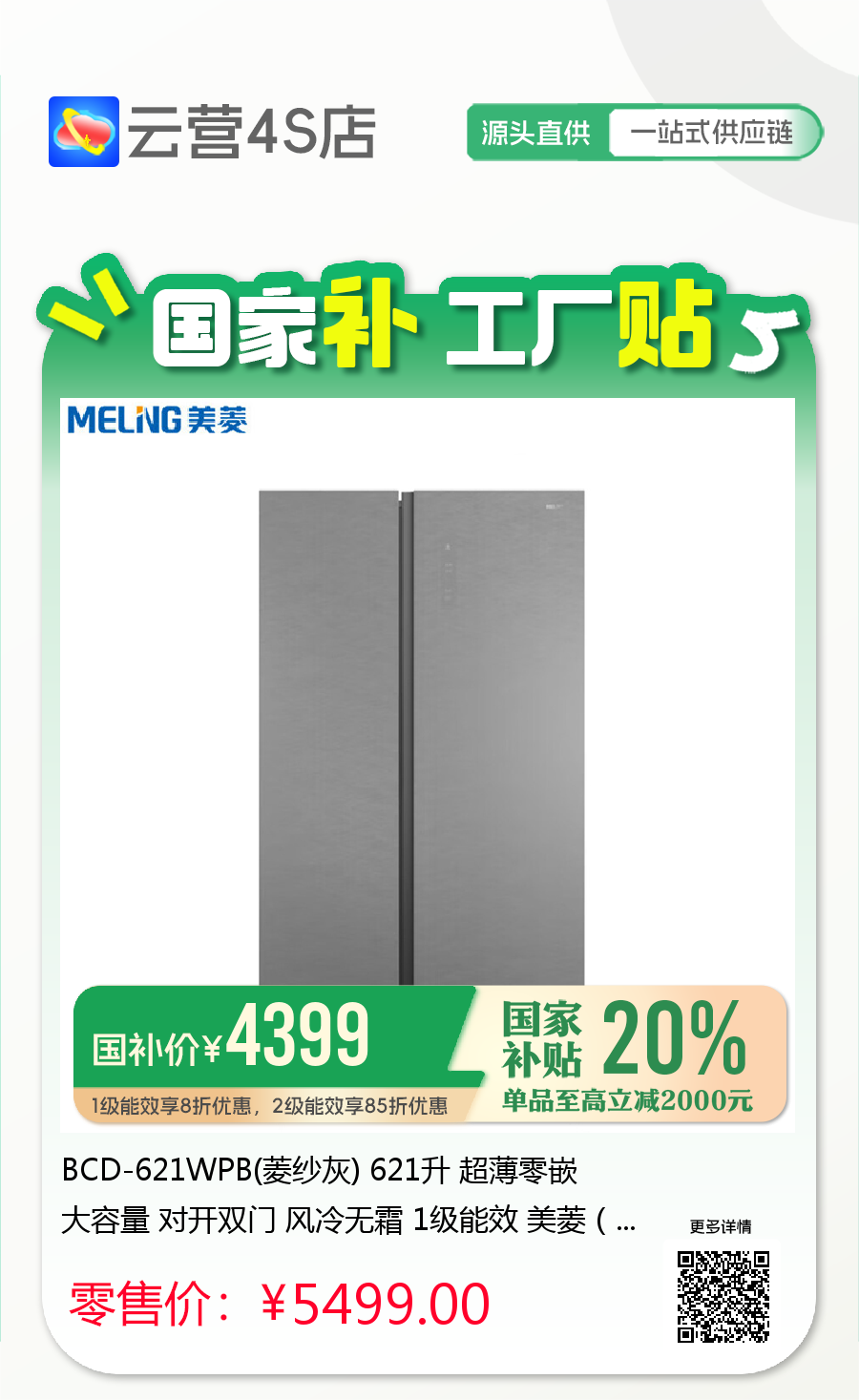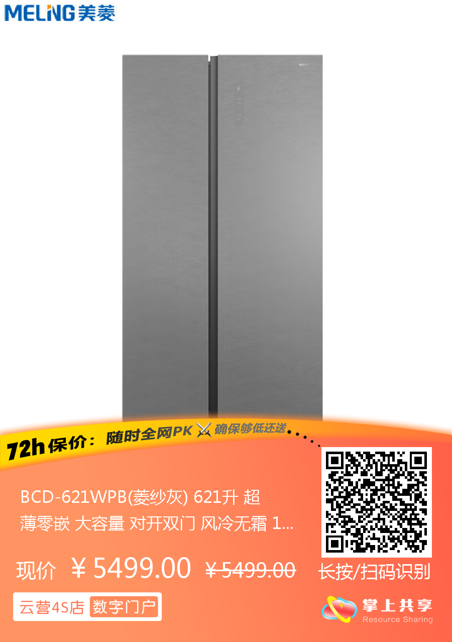 BCD-621WPB(菱纱灰) 621升 超薄零嵌 大容量 对开双门 风冷无霜 1级能效 美菱(MeiLing)