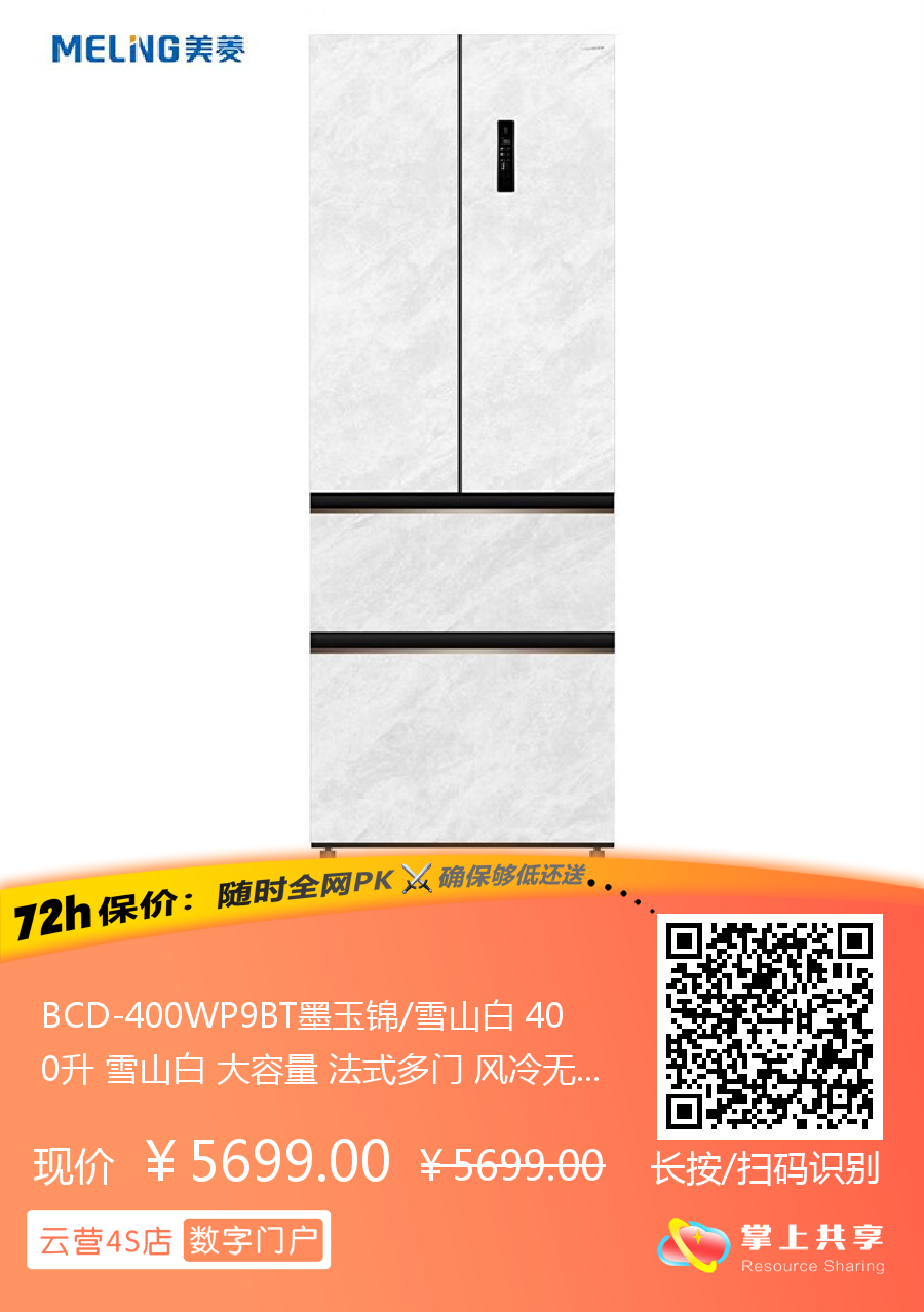 BCD-400WP9BT墨玉锦/雪山白 400升 雪山白 大容量 法式多门 风冷无霜 1级能效 美菱(MeiLing) 臻鲜净