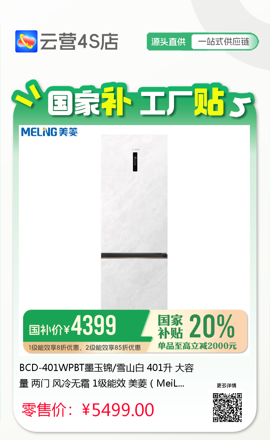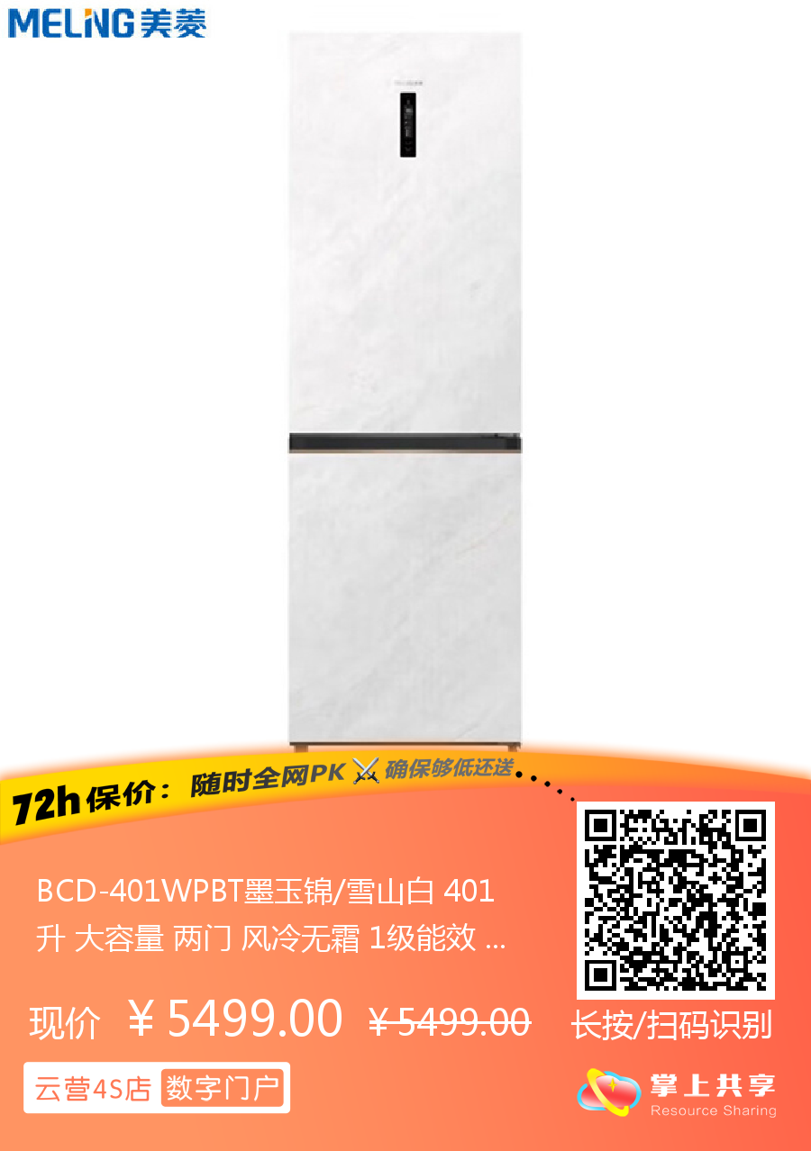 BCD-401WPBT墨玉锦/雪山白 401升 大容量 两门 风冷无霜 1级能效 美菱(MeiLing)