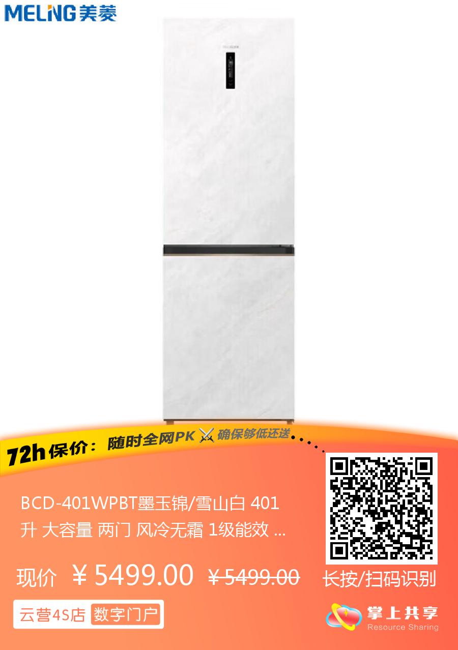BCD-401WPBT墨玉锦/雪山白 401升 大容量 两门 风冷无霜 1级能效 美菱(MeiLing)