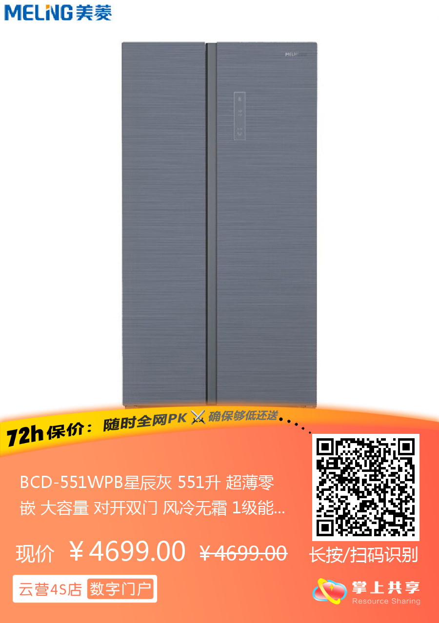 BCD-551WPB星辰灰 551升 超薄零嵌 大容量 对开双门 风冷无霜 1级能效 美菱(MeiLing)