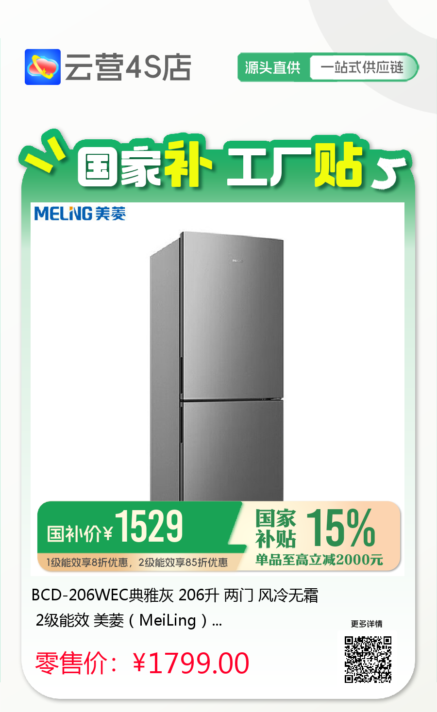BCD-206WEC典雅灰 206升 两门 风冷无霜 2级能效 美菱(MeiLing)