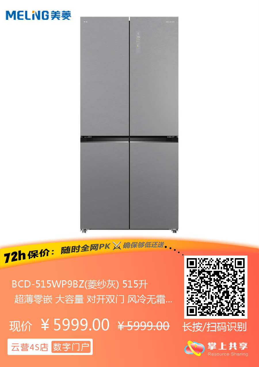 BCD-515WP9BZ(菱纱灰) 515升 超薄零嵌 大容量 对开双门 风冷无霜 1级能效 美菱(MeiLing) 臻鲜净