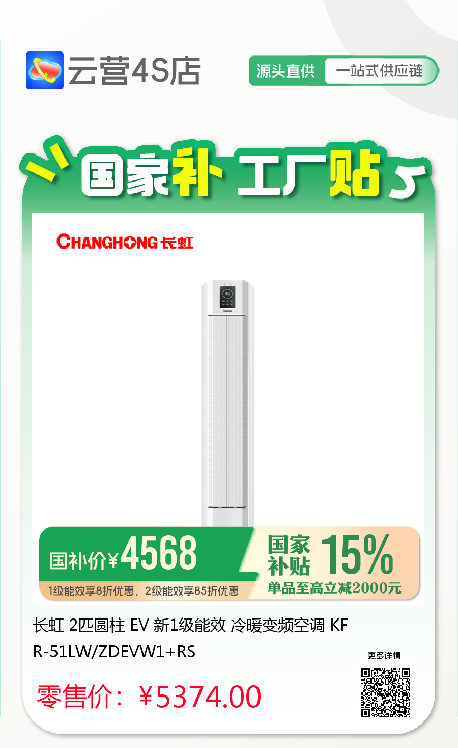 长虹 2匹圆柱 EV 新1级能效 冷暖变频空调 KFR-51LW/ZDEVW1+RS