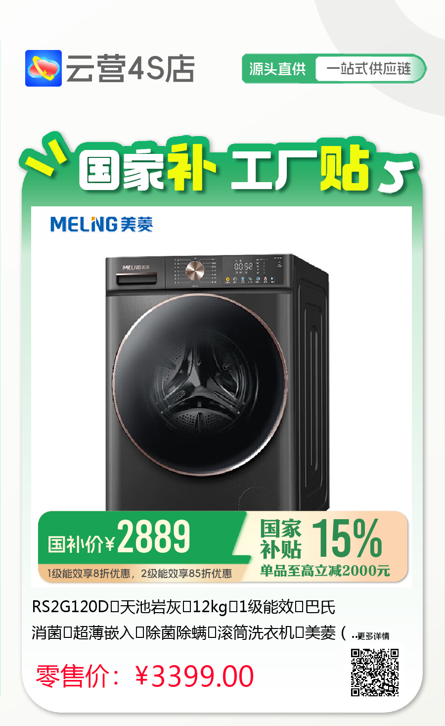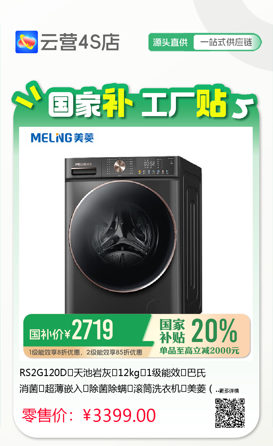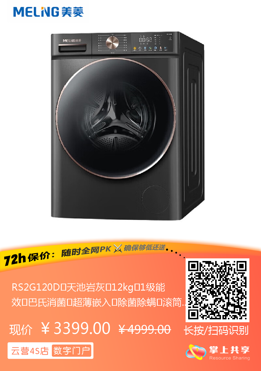 RS2G120D 天池岩灰 12kg 1级能效 巴氏消菌 超薄嵌入 除菌除螨 滚筒洗衣机 美菱(MeiLing) 如手洗系列