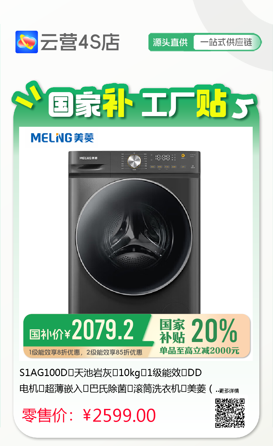 S1AG100D 天池岩灰 10kg 1级能效 DD电机 超薄嵌入 巴氏除菌 滚筒洗衣机 美菱(MeiLing)