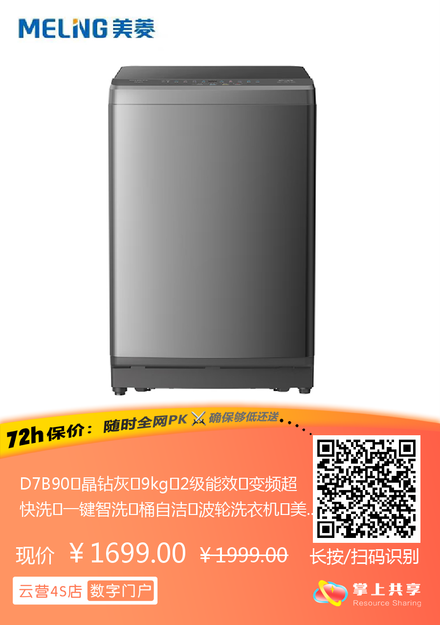 D7B90 晶钻灰 9kg 2级能效 变频超快洗 一键智洗 桶自洁 波轮洗衣机 美菱(MeiLing) 大力神系列