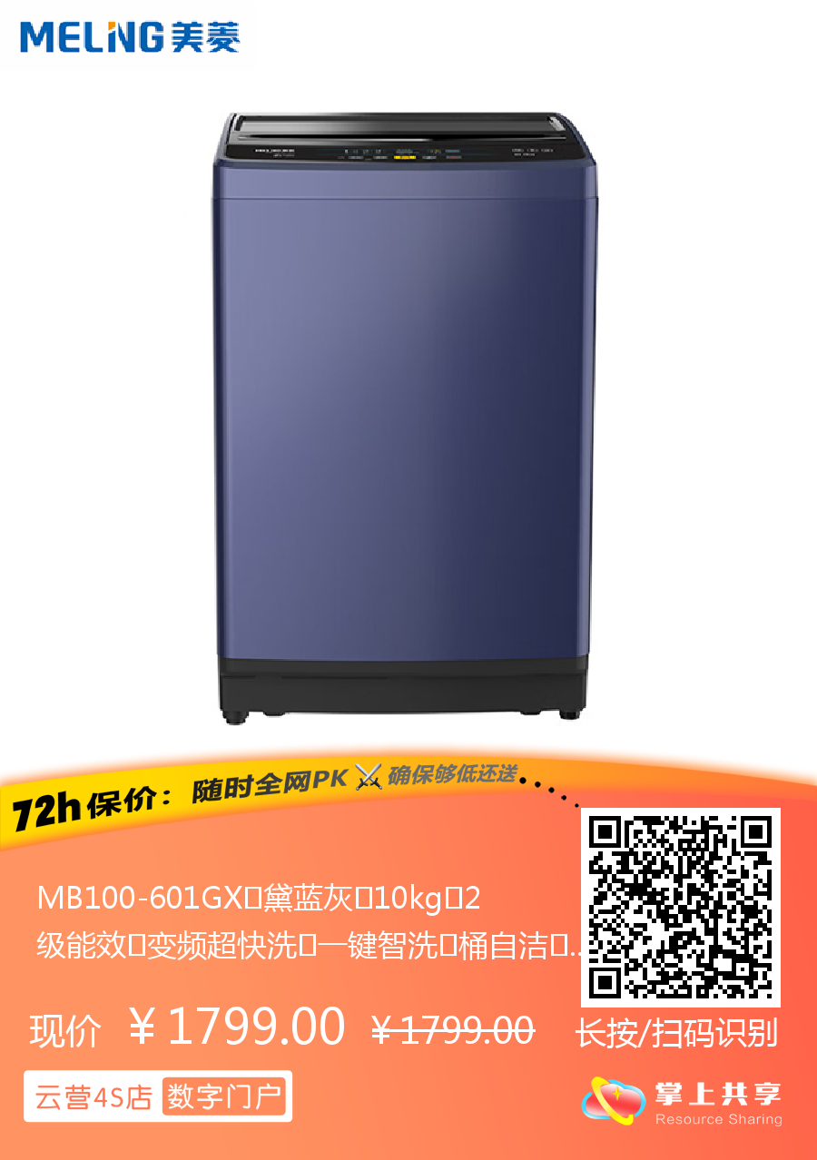 MB100-601GX 黛蓝灰 10kg 2级能效 变频超快洗 一键智洗 桶自洁 波轮洗衣机 美菱(MeiLing)
