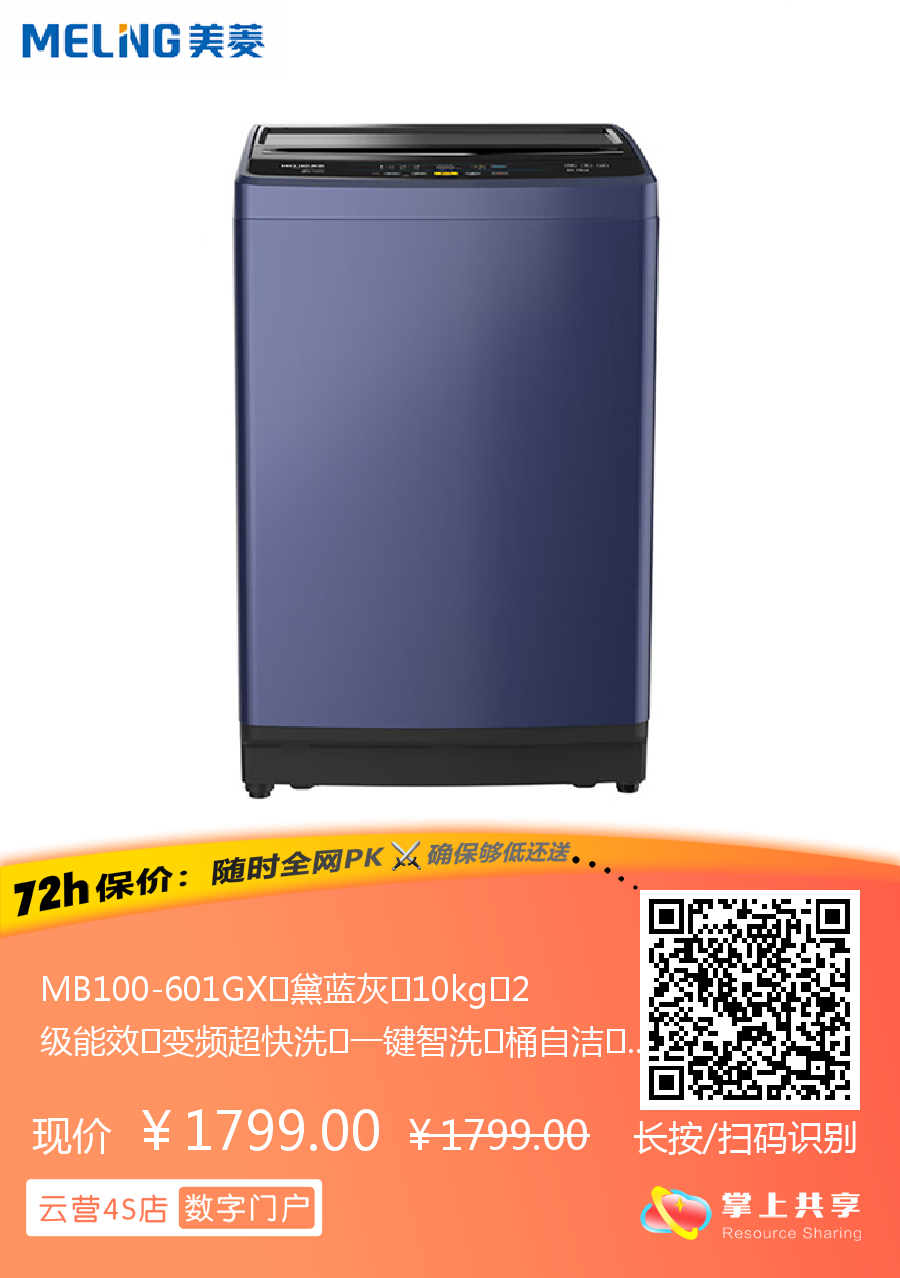 MB100-601GX 黛蓝灰 10kg 2级能效 变频超快洗 一键智洗 桶自洁 波轮洗衣机 美菱(MeiLing)