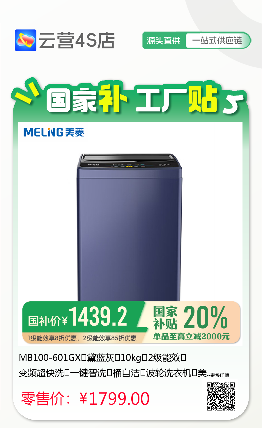 MB100-601GX 黛蓝灰 10kg 2级能效 变频超快洗 一键智洗 桶自洁 波轮洗衣机 美菱(MeiLing)