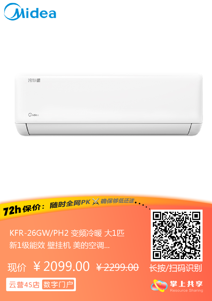 美的 大1匹挂机 冷静星III 新1级能效 冷暖变频空调 KFR-26GW/PH2