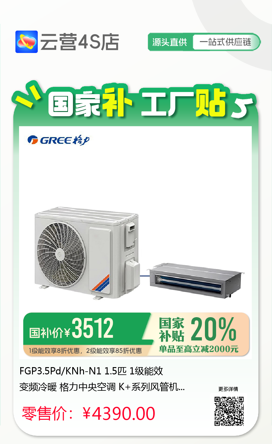 FGP3.5Pd/KNh-N1 1.5匹 1级能效 变频冷暖 格力中央空调 K+系列风管机