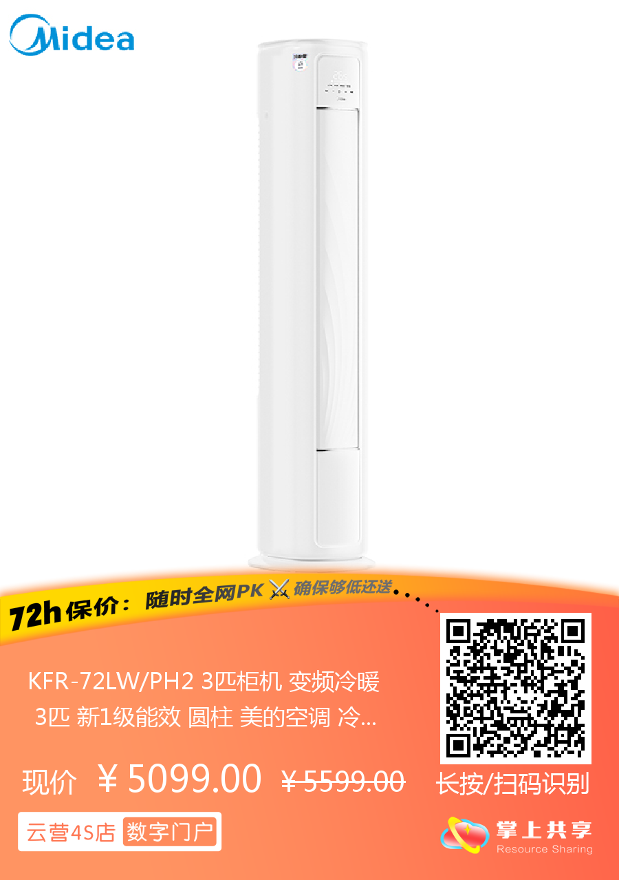 美的 3匹圆柱 冷静星 新1级能效 冷暖变频空调 KFR-72LW/PH2