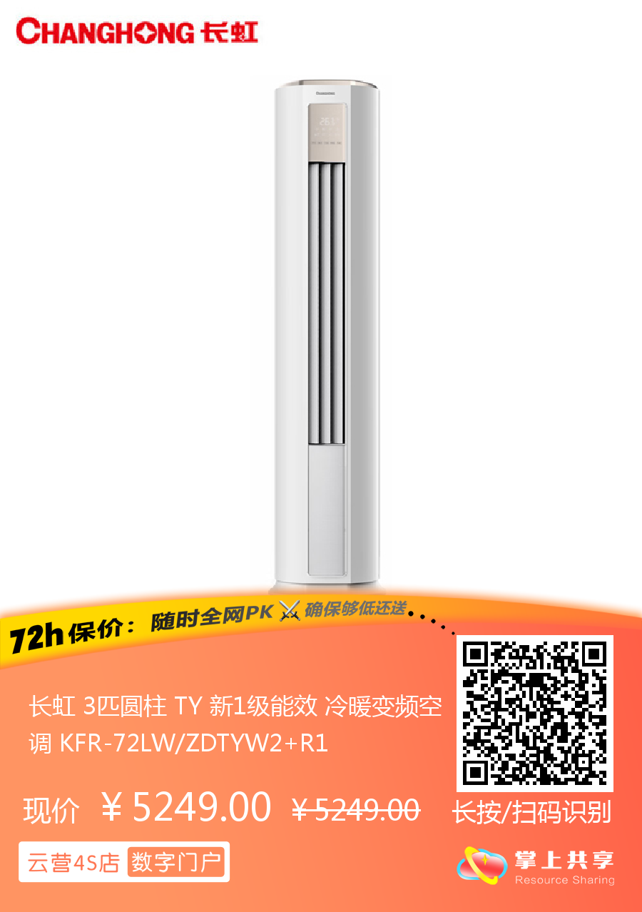 长虹 3匹圆柱 TY 新1级能效 冷暖变频空调 KFR-72LW/ZDTYW2+R1