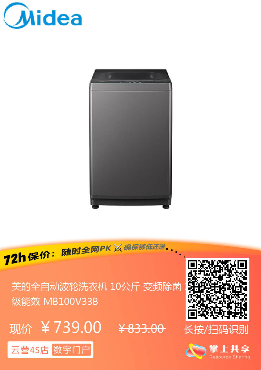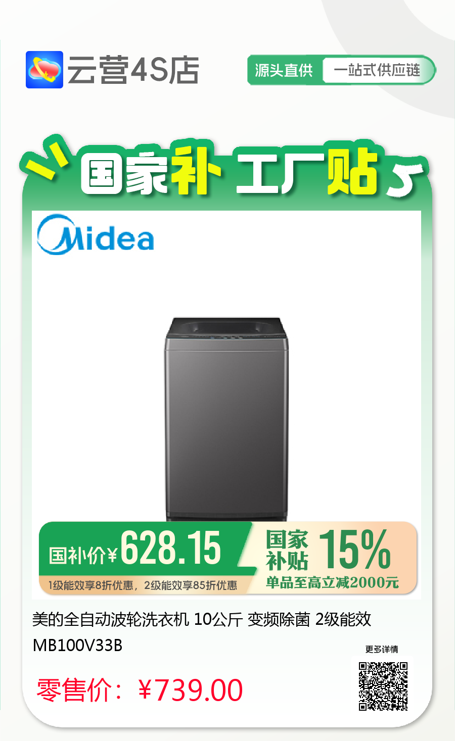 美的全自动波轮洗衣机 10公斤 变频除菌 2级能效 MB100V33B