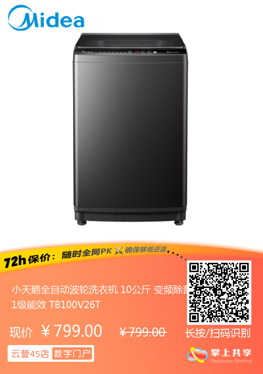 小天鹅全自动波轮洗衣机 10公斤 变频除菌 1级能效 TB100V26T