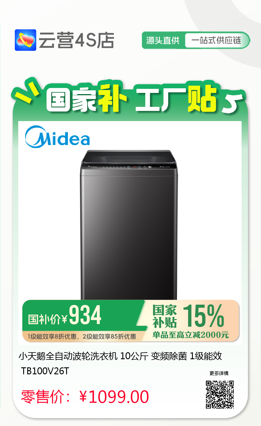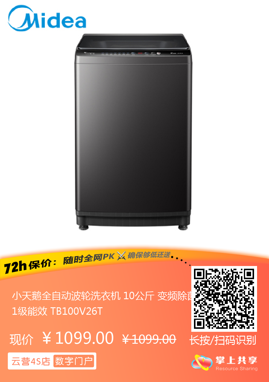 小天鹅全自动波轮洗衣机 10公斤 变频除菌 1级能效 TB100V26T