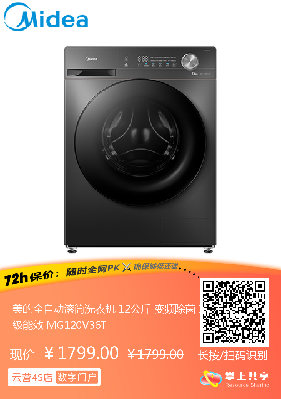 美的全自动滚筒洗衣机 12公斤 变频除菌 1级能效 MG120V36T