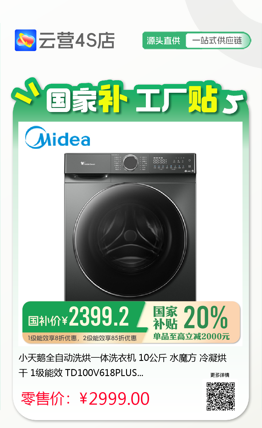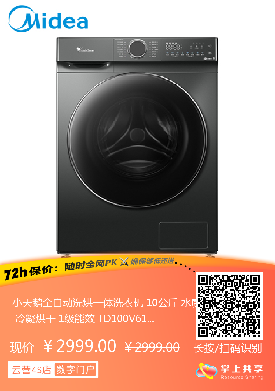 小天鹅全自动洗烘一体洗衣机 10公斤 水魔方 冷凝烘干 1级能效 TD100V618PLUS