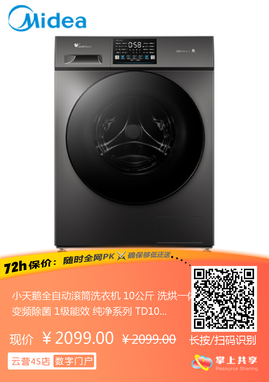 小天鹅全自动滚筒洗衣机 10公斤 洗烘一体 变频除菌 1级能效 纯净系列 TD100V23PRO