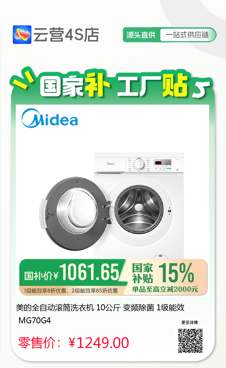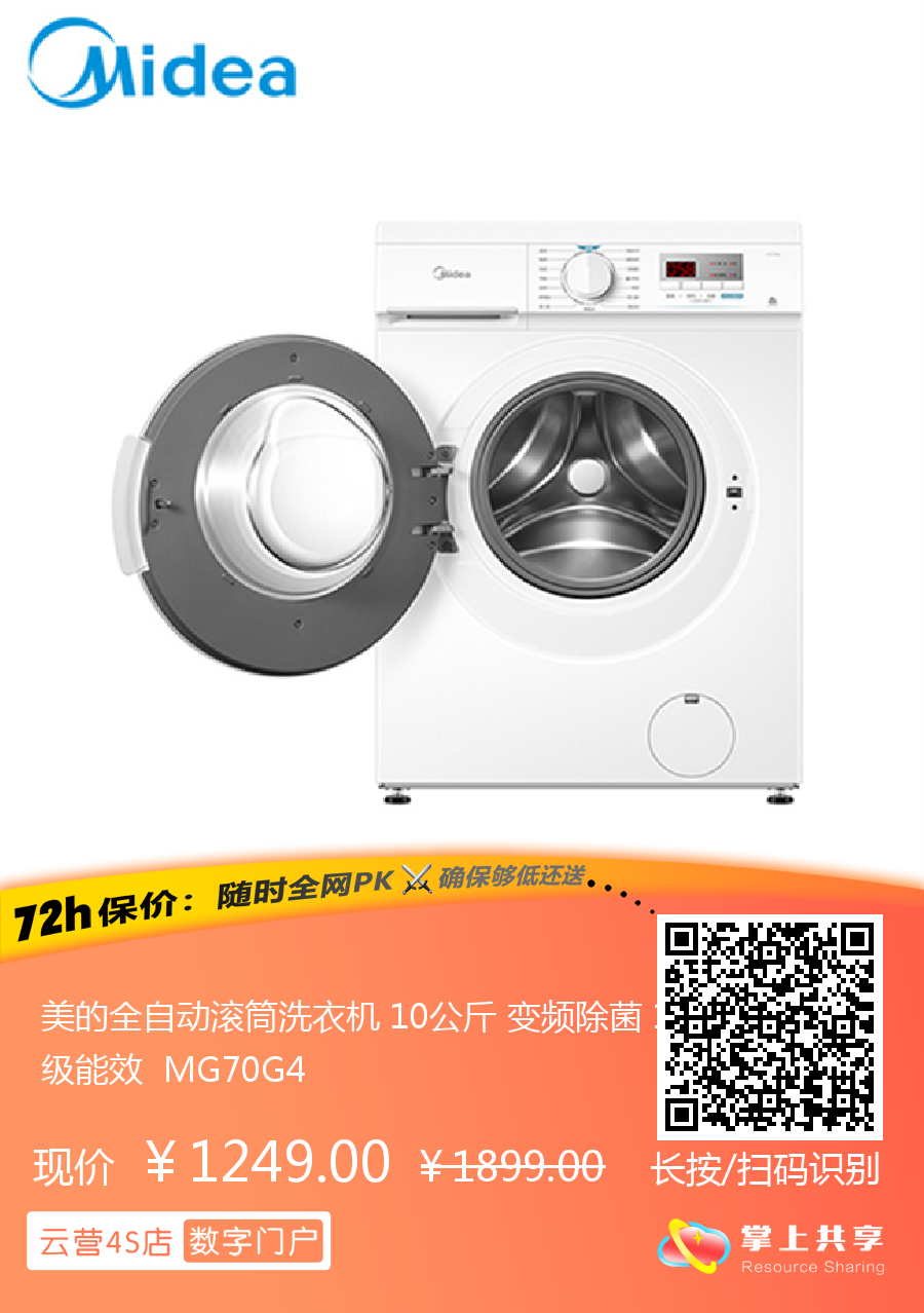 美的全自动滚筒洗衣机 10公斤 变频除菌 1级能效 MG70G4