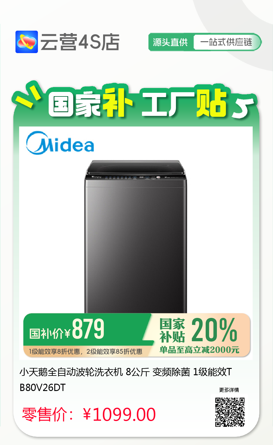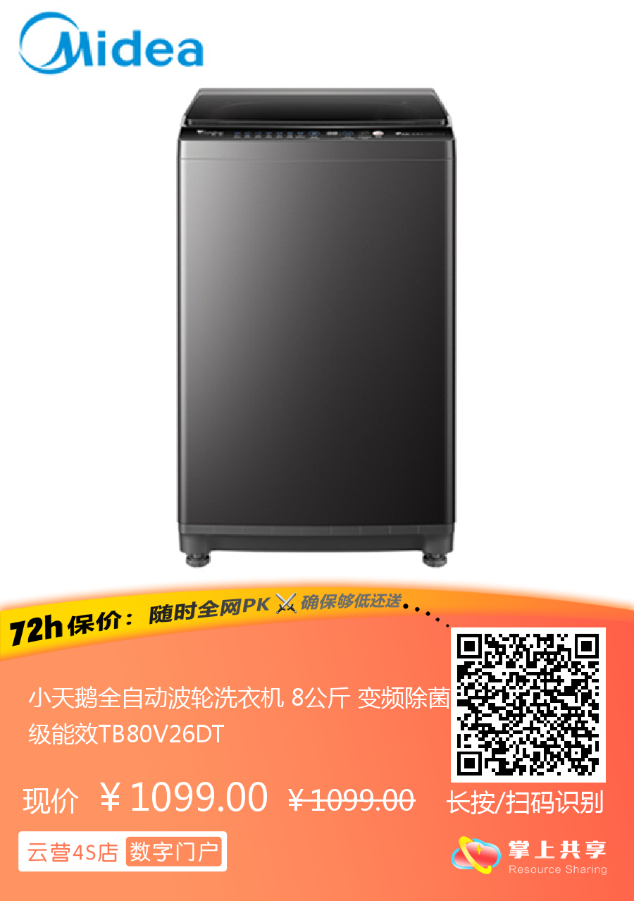小天鹅全自动波轮洗衣机 8公斤 变频除菌 1级能效TB80V26DT