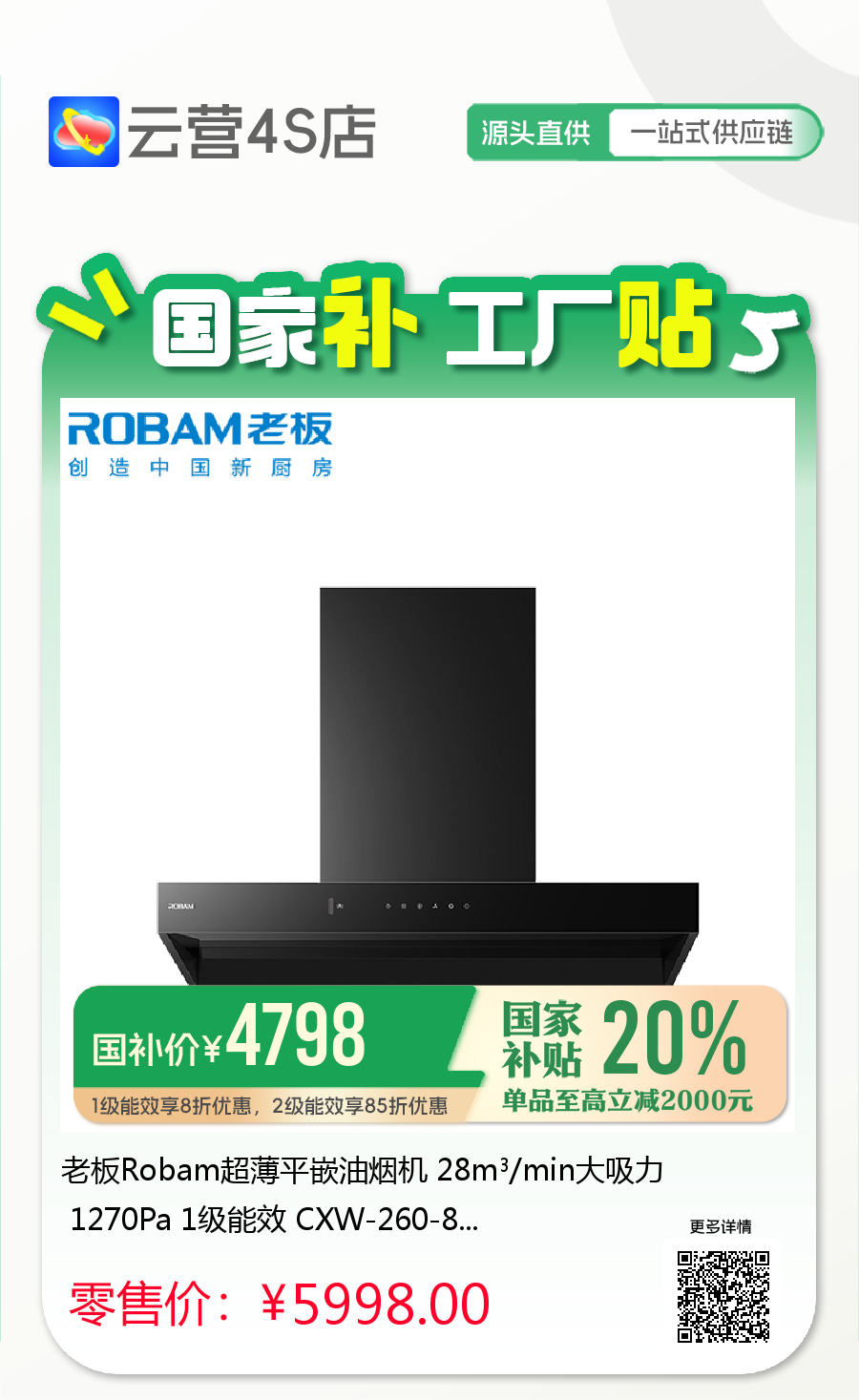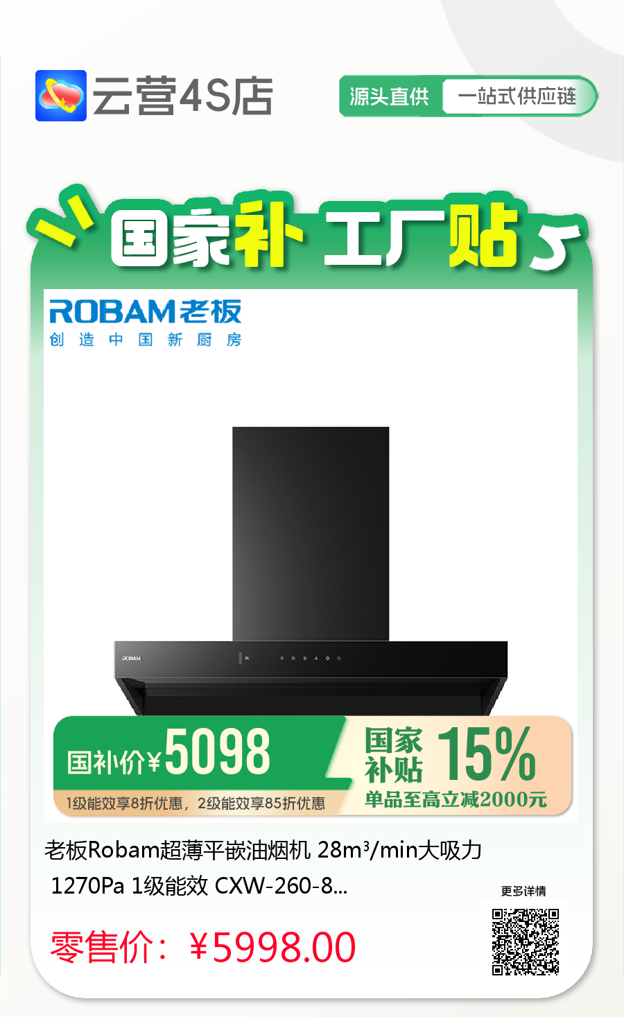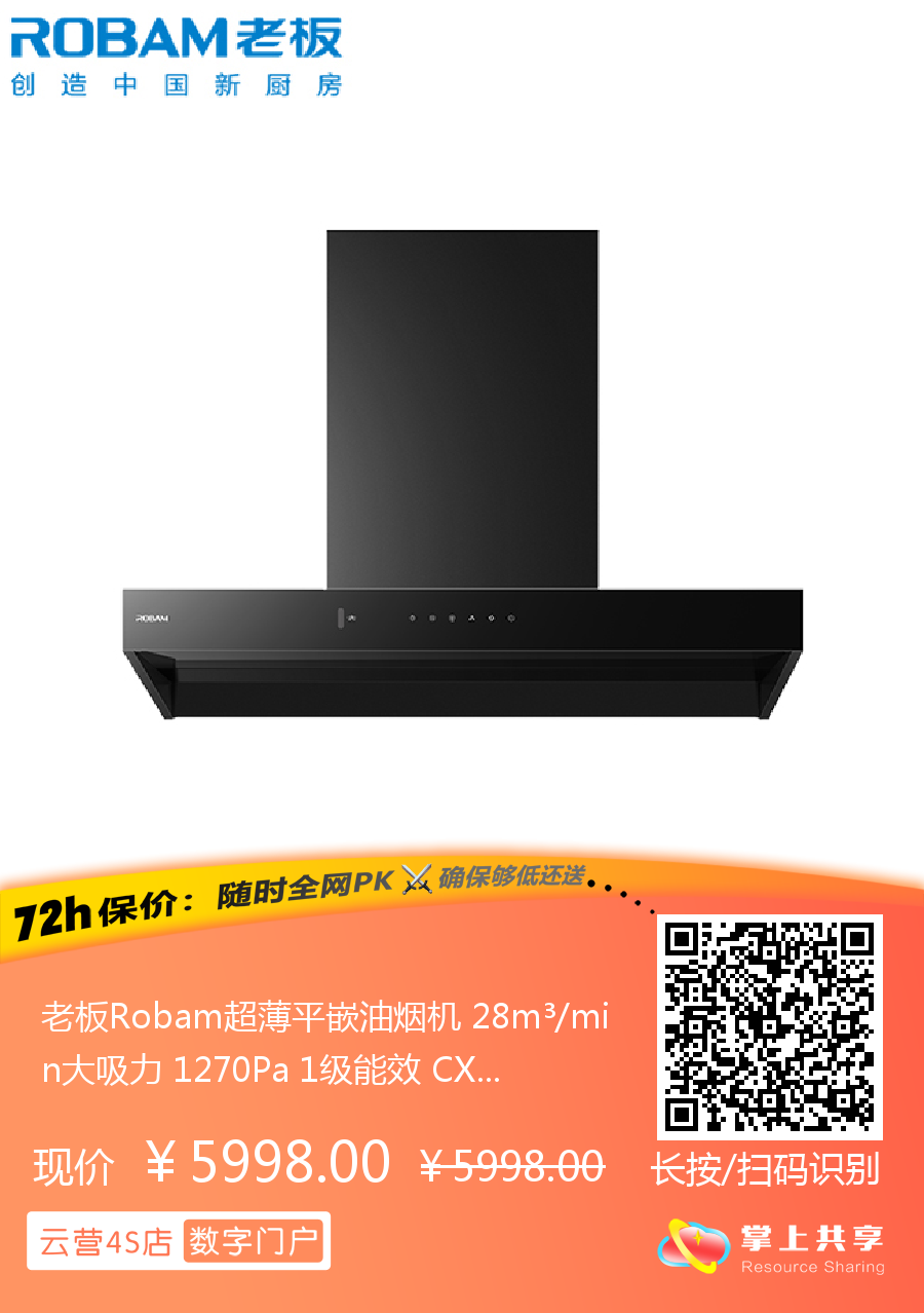 老板Robam超薄平嵌油烟机 28m³/min大吸力 1270Pa 1级能效 CXW-260-8665-K1L