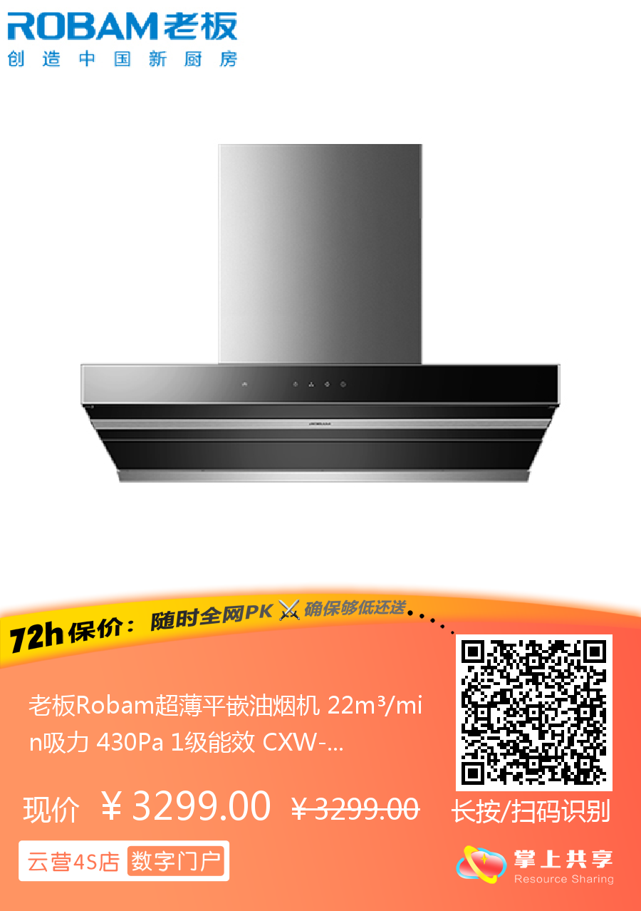 老板Robam超薄平嵌油烟机 22m³/min吸力 430Pa 1级能效 CXW-330-5201