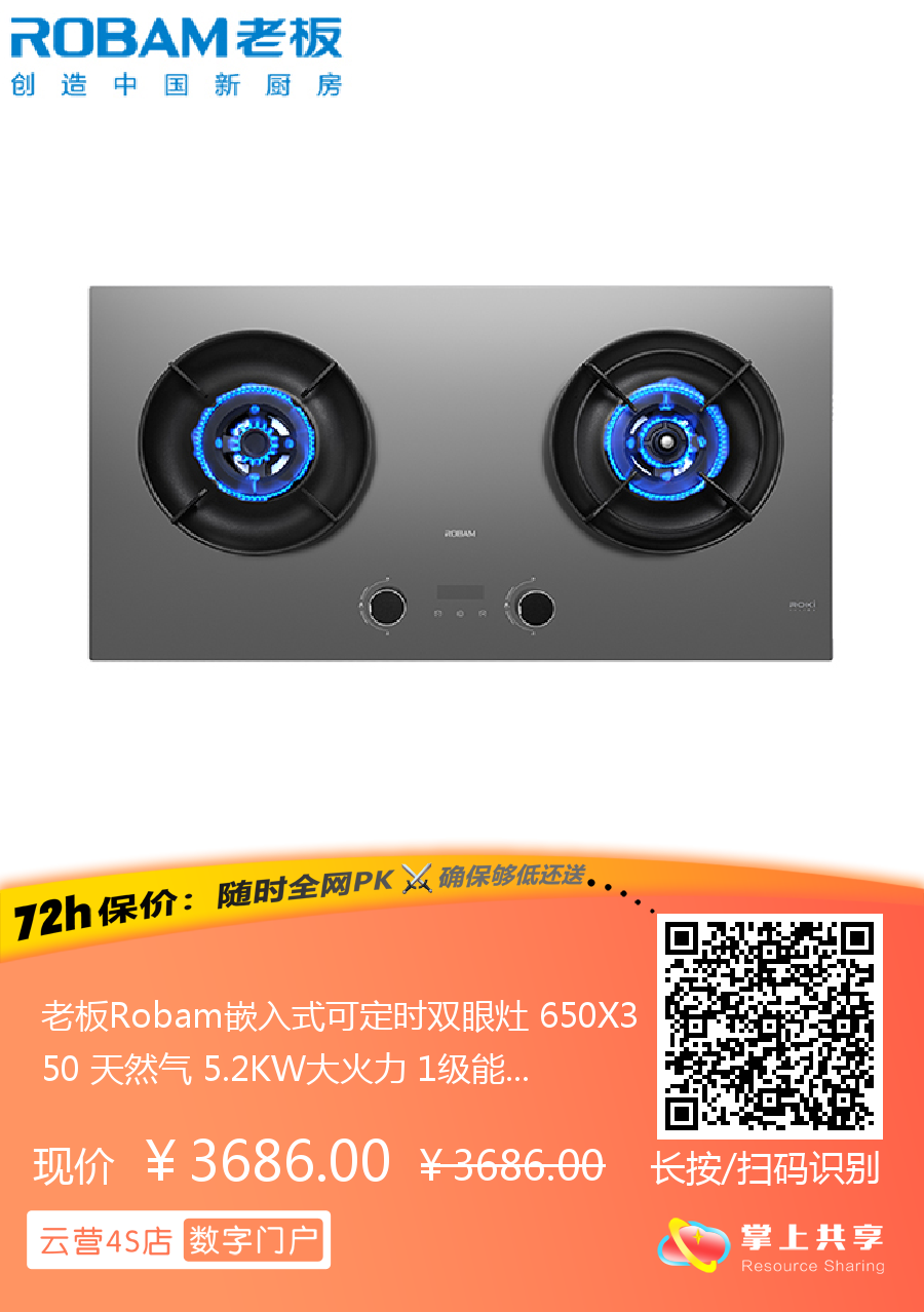 老板Robam嵌入式可定时双眼灶 650X350 天然气 5.2KW大火力 1级能效 9B1-i1灰