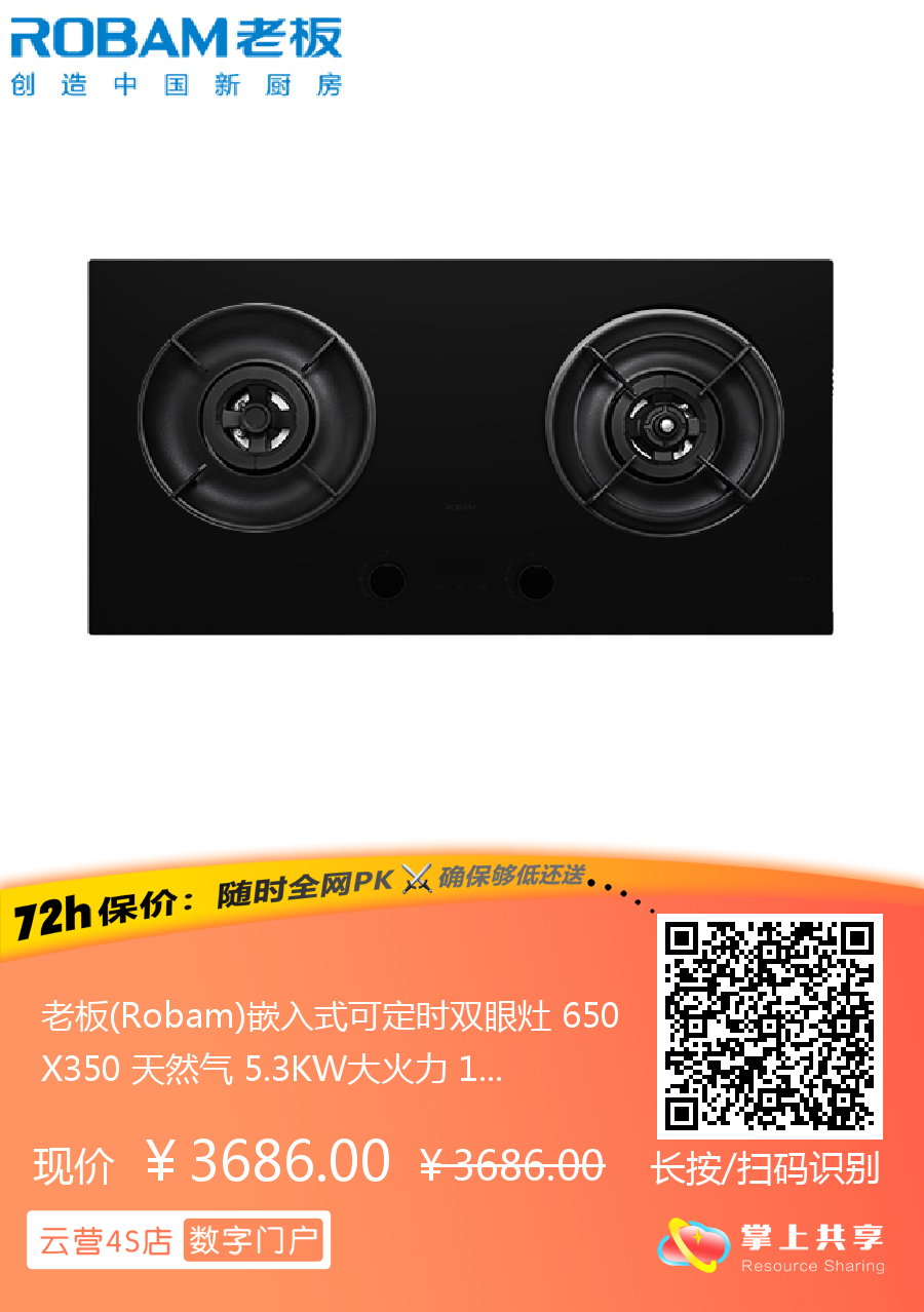 老板(Robam)嵌入式可定时双眼灶 650X350 天然气 5.3KW大火力 1级能效 9B1-i1黑