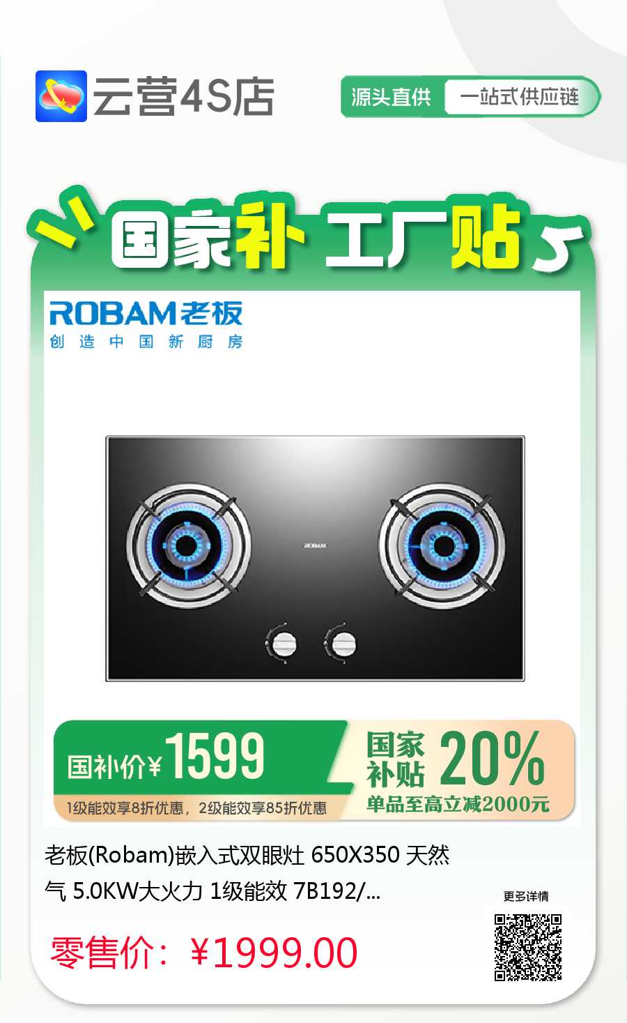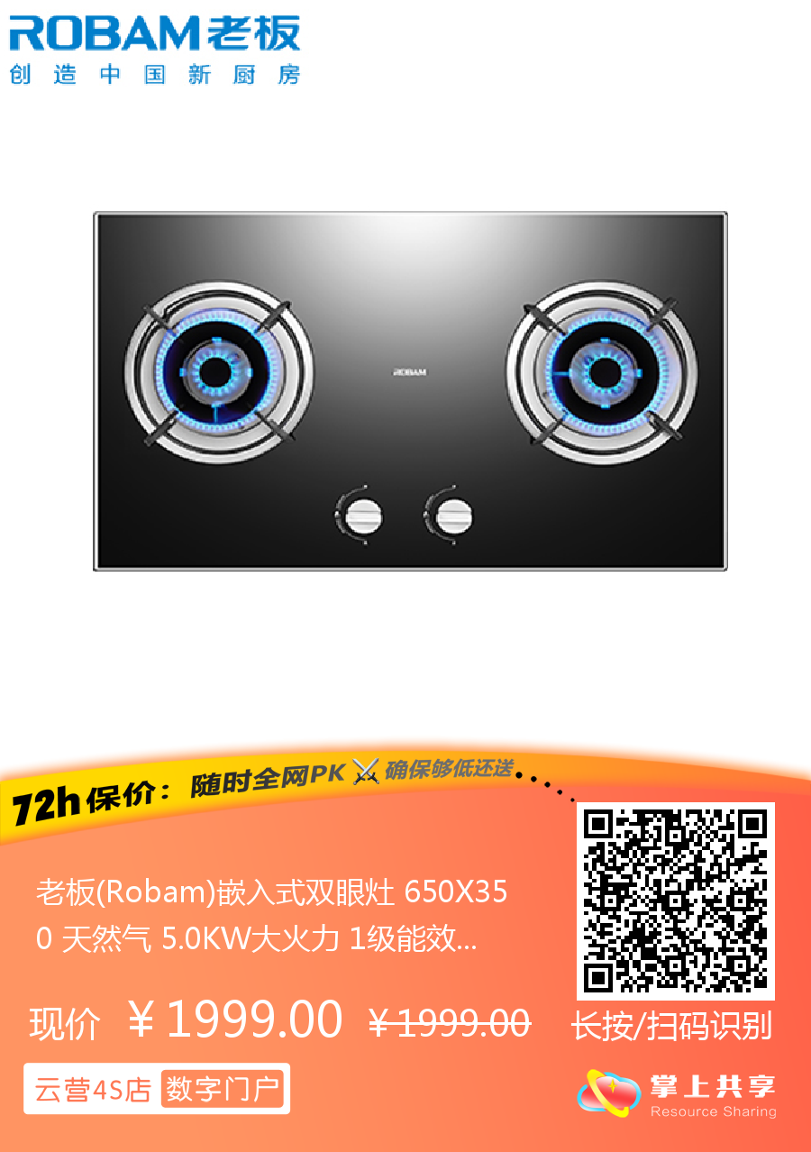 老板(Robam)嵌入式双眼灶 650X350 天然气 5.0KW大火力 1级能效 7B192/7B100