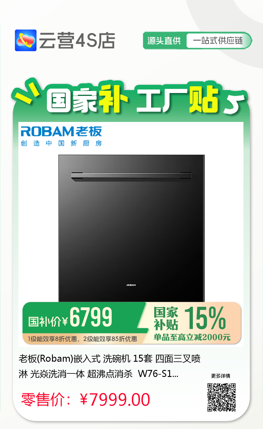老板(Robam)嵌入式 洗碗机 15套 四面三叉喷淋 光焱洗消一体 超沸点消杀 W76-S1L