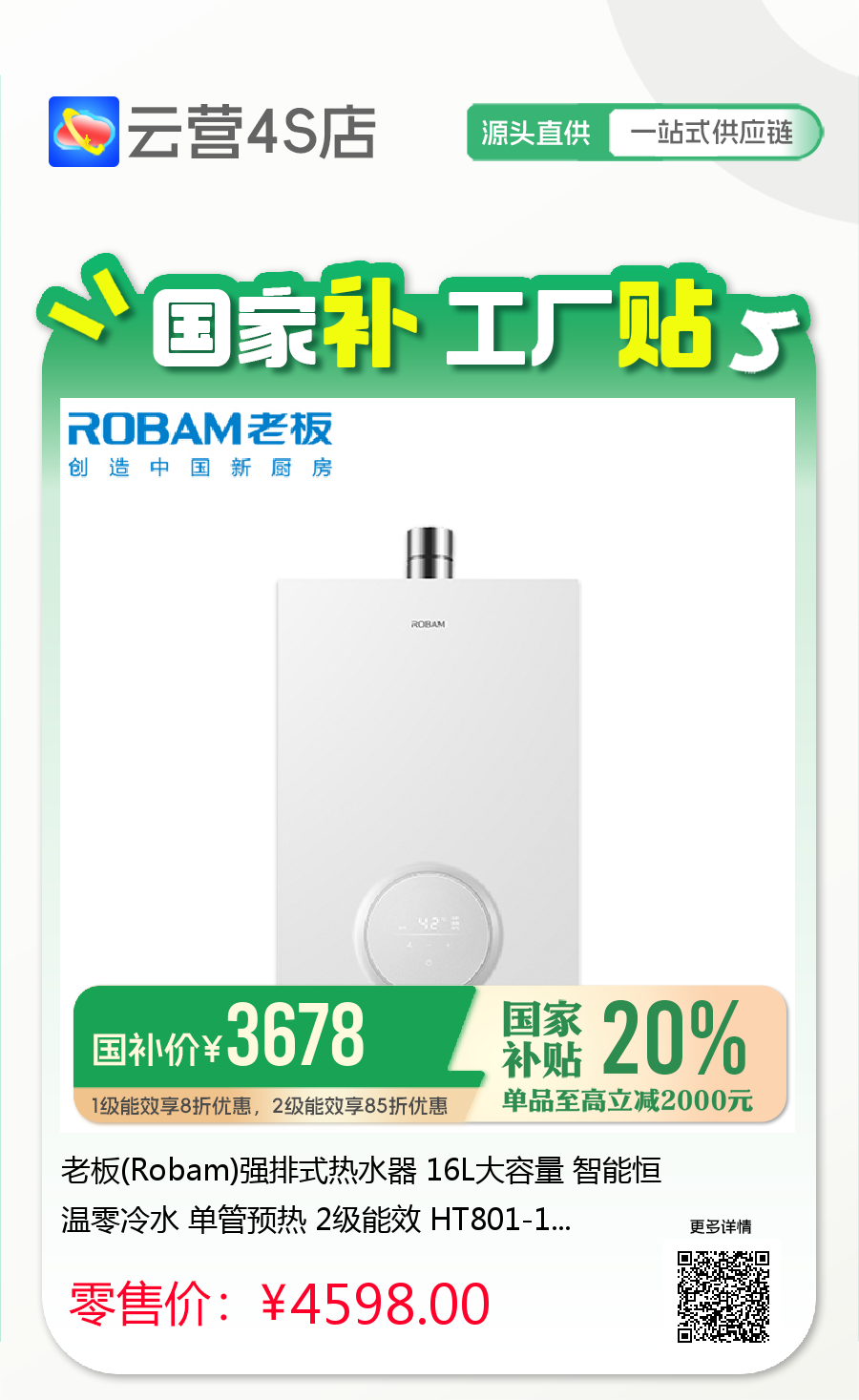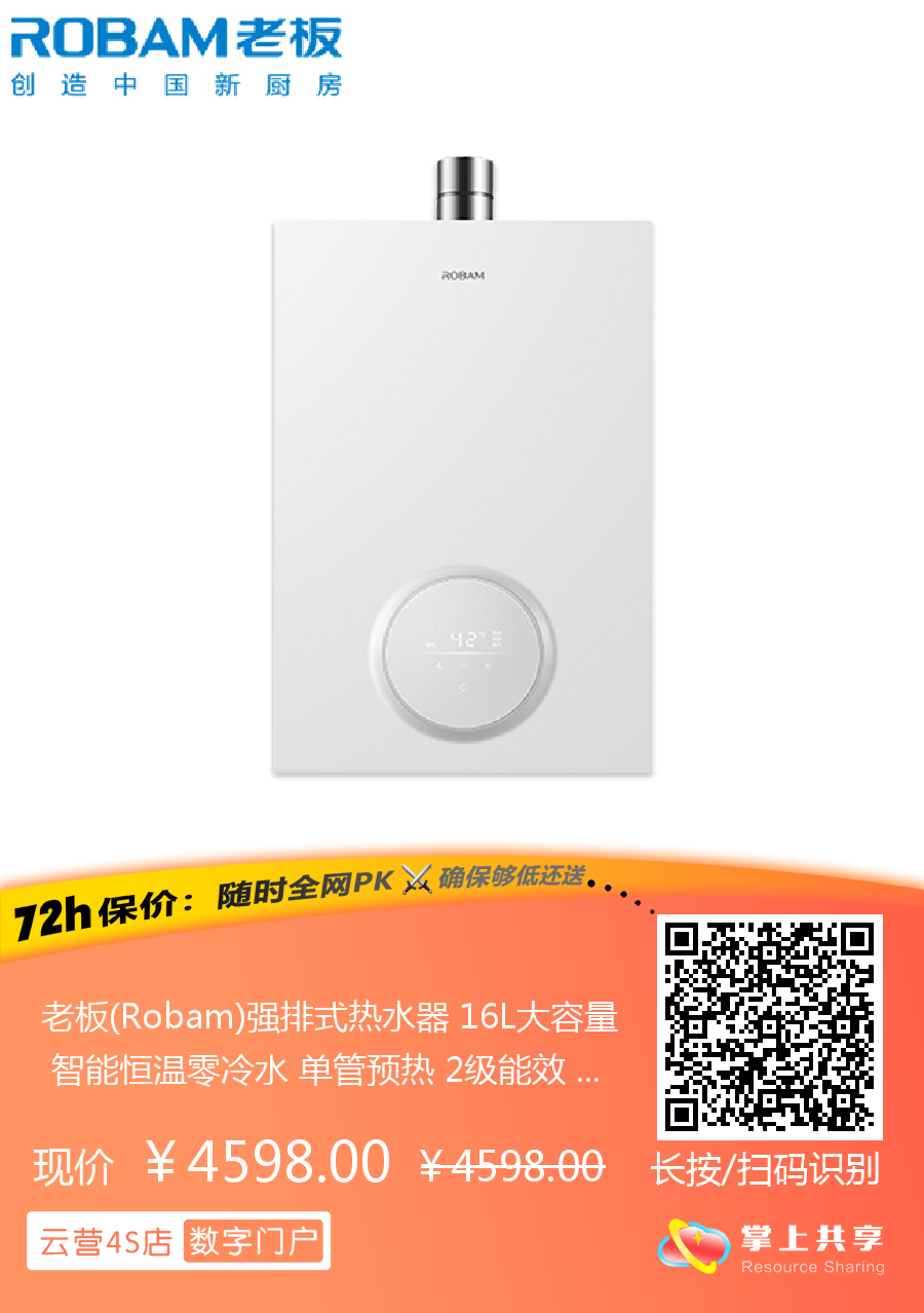 老板(Robam)强排式热水器 16L大容量 智能恒温零冷水 单管预热 2级能效 HT801-16
