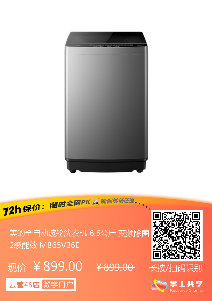 美的全自动波轮洗衣机 6.5公斤 变频除菌 2级能效 MB65V36E