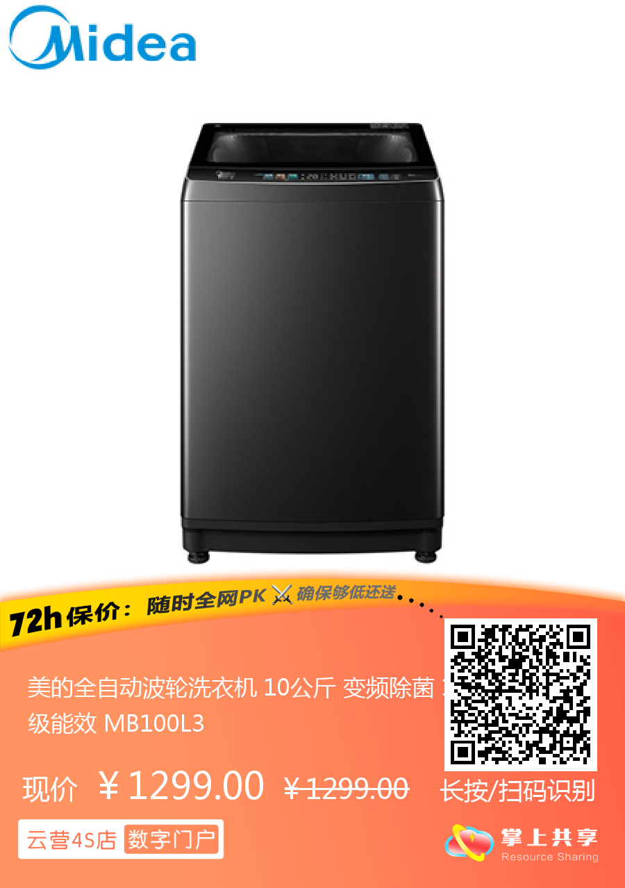 美的全自动波轮洗衣机 10公斤 变频除菌 1级能效 MB100L3