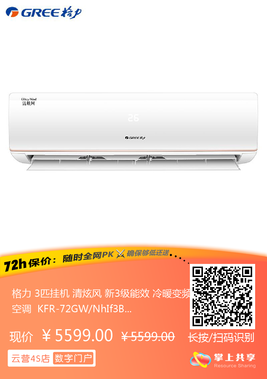 格力 3匹挂机 清炫风 新3级能效 冷暖变频空调 KFR-72GW/NhIf3BAt