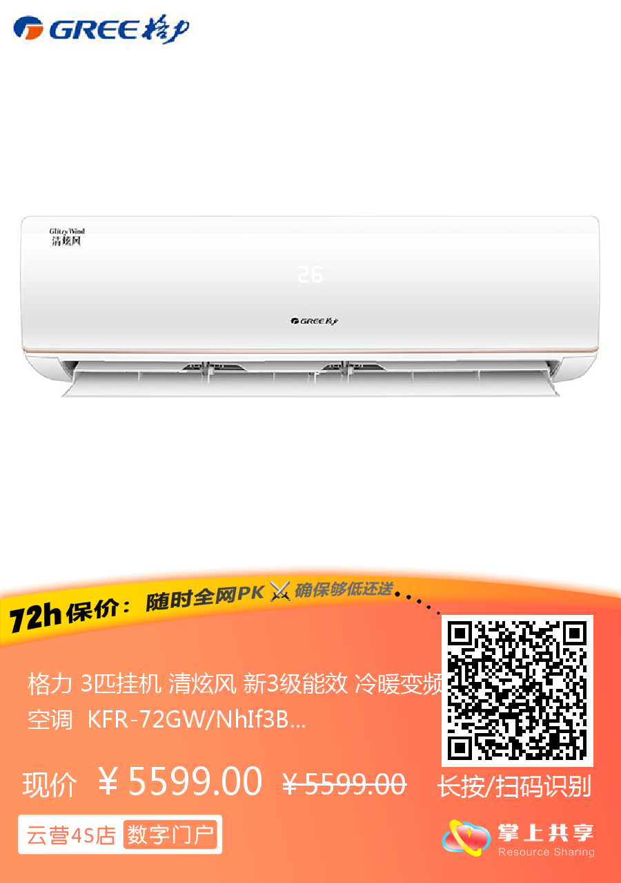 格力 3匹挂机 清炫风 新3级能效 冷暖变频空调 KFR-72GW/NhIf3BAt