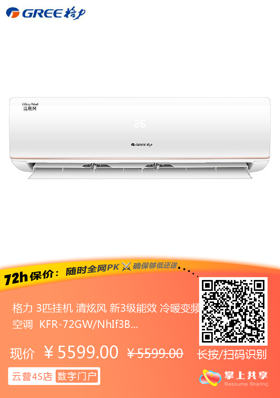 格力 3匹挂机 清炫风 新3级能效 冷暖变频空调 KFR-72GW/NhIf3BAt