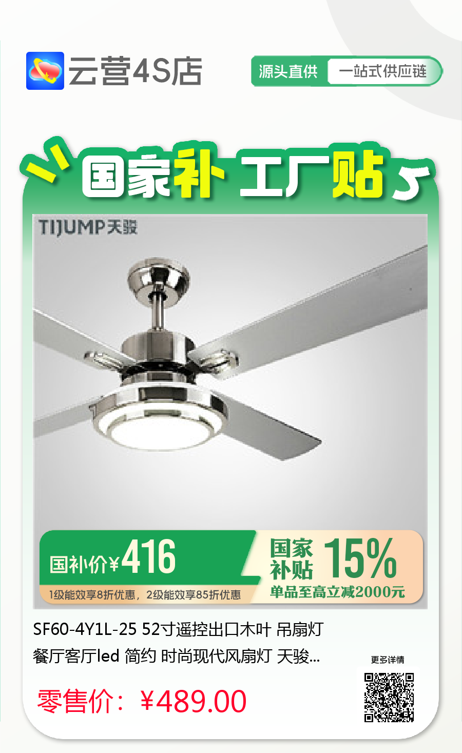 SF60-4Y1L-25 52寸遥控出口木叶 吊扇灯餐厅客厅led 简约 时尚现代风扇灯 天骏