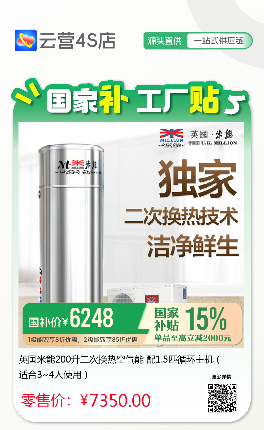 英国米能200升二次换热空气能 配1.5匹循环主机(适合3~4人使用)