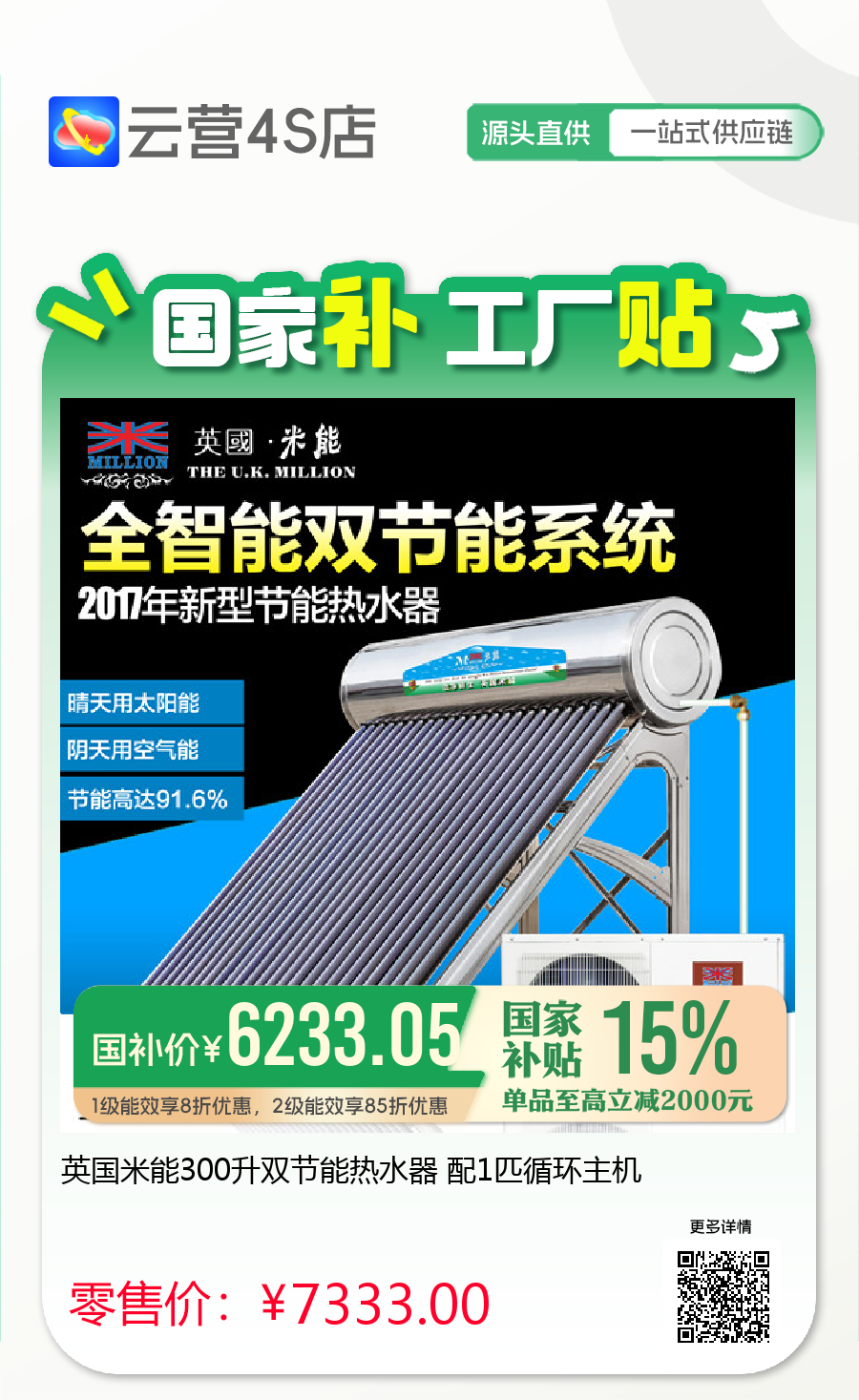 英国米能300升双节能热水器 配1匹循环主机