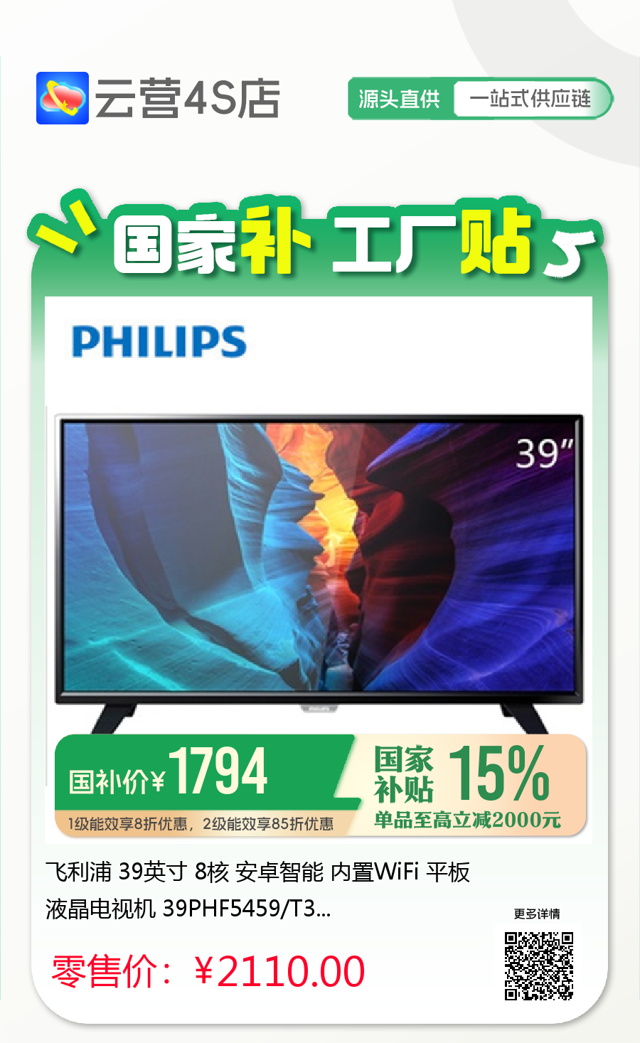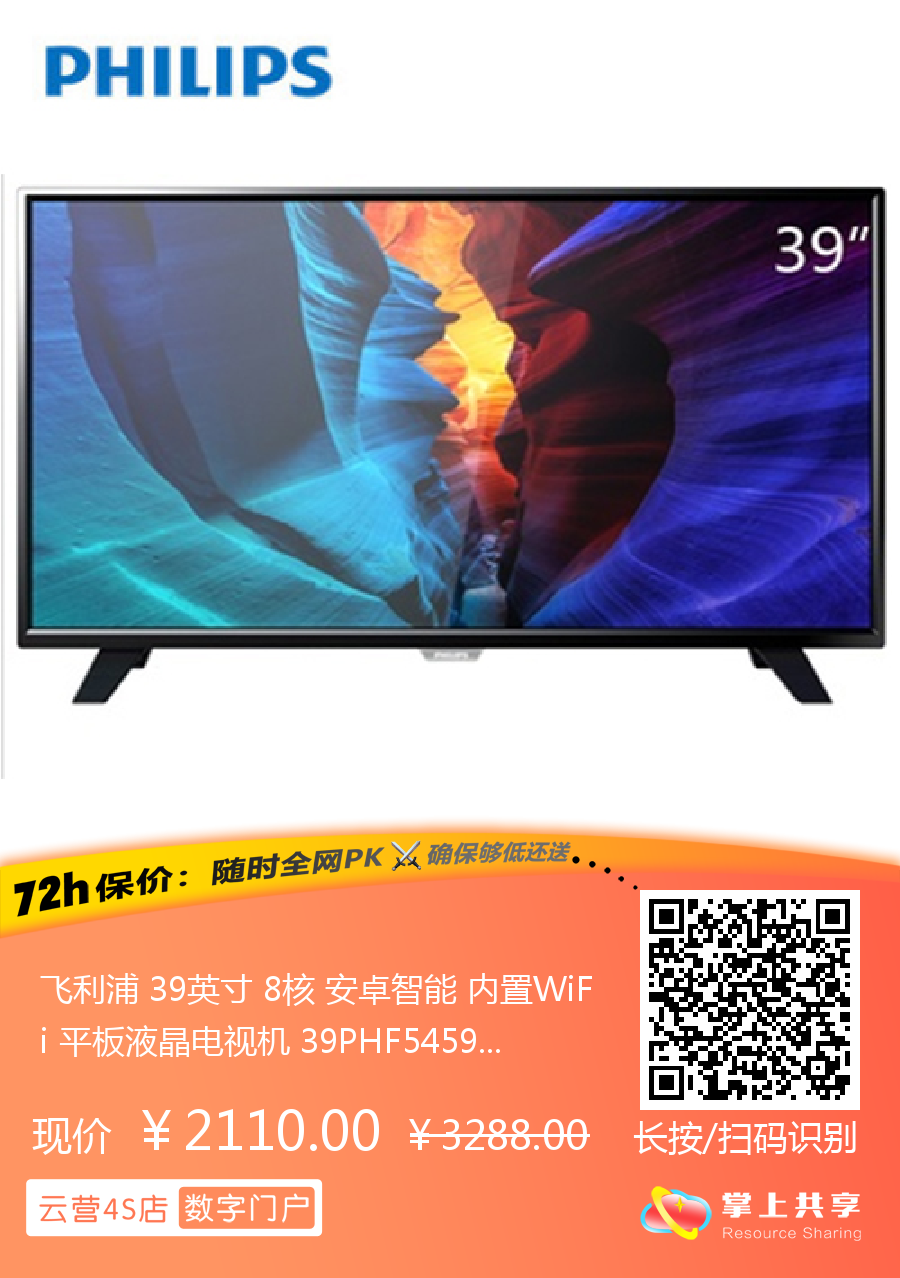 飞利浦 39英寸 8核 安卓智能 内置WiFi 平板液晶电视机 39PHF5459/T3