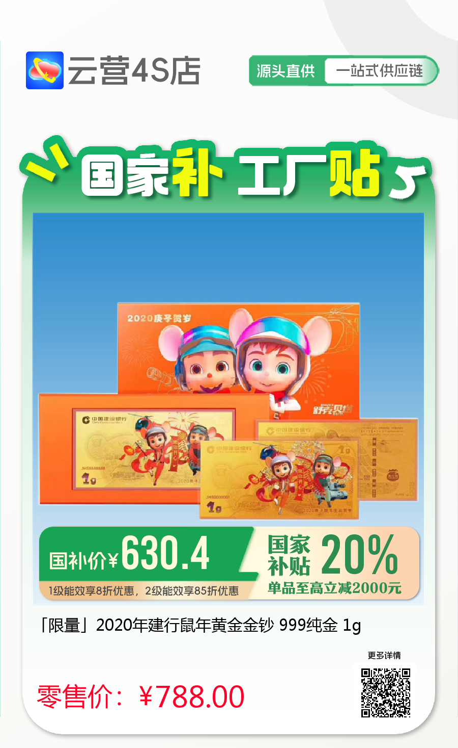 「限量」2020年建行鼠年黄金金钞 999纯金 1g