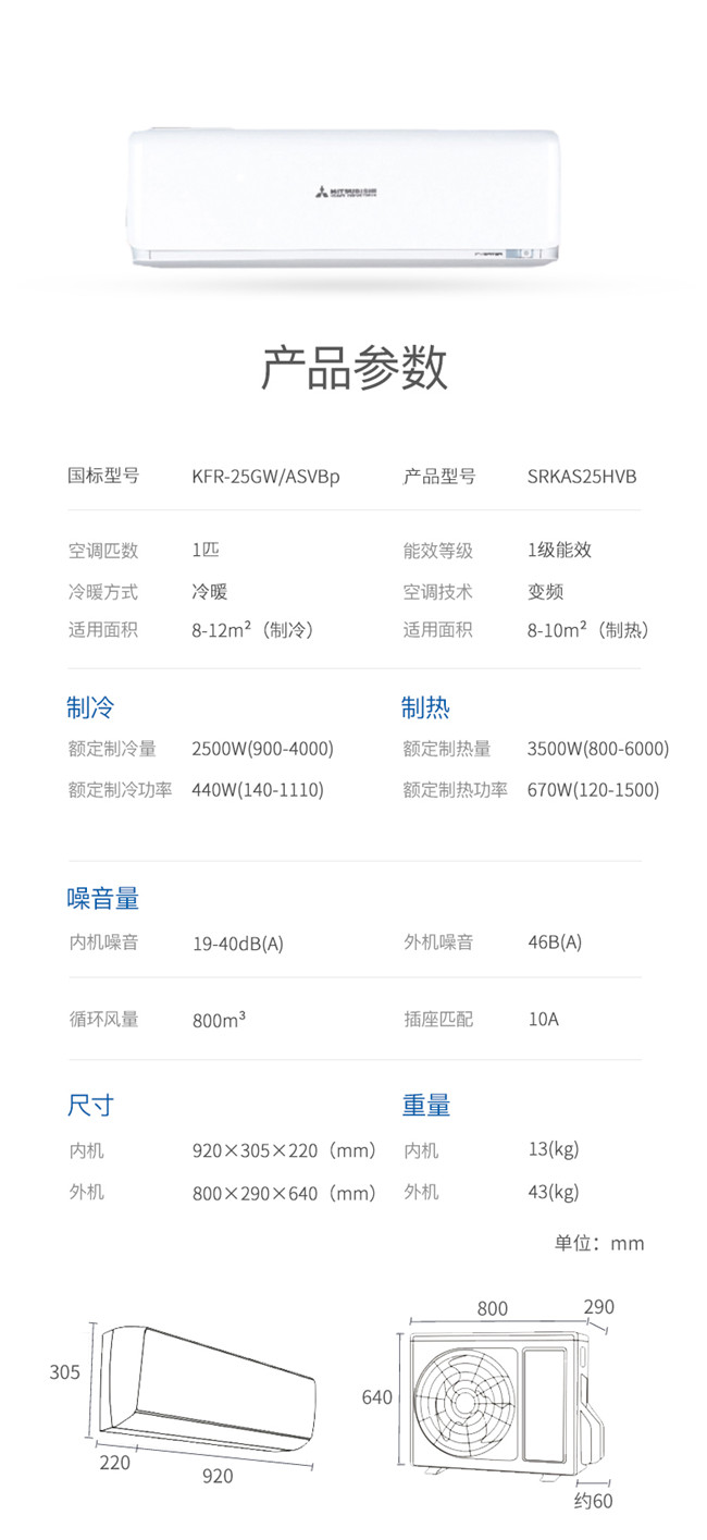 三菱重工 大1匹挂机 ASV 新1级能效 冷暖变频空调 SRKAS25HVB