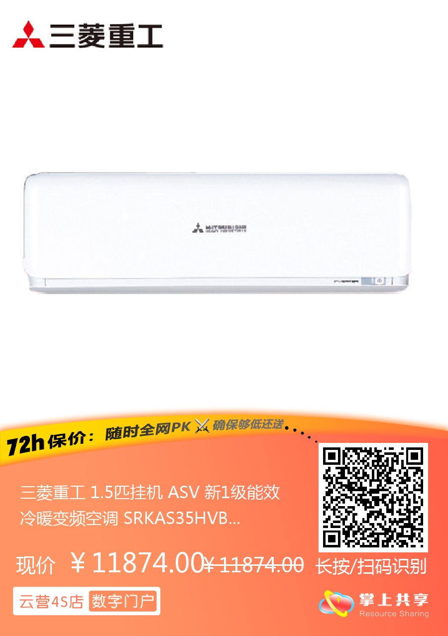 三菱重工 1.5匹挂机 ASV 新1级能效 冷暖变频空调 SRKAS35HVB