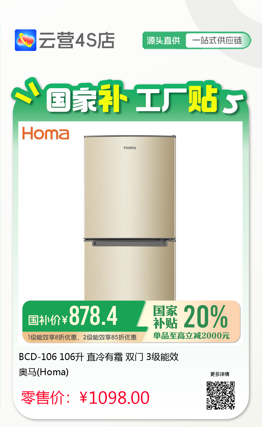 BCD-106 106升 直冷有霜 双门 3级能效 奥马(Homa)