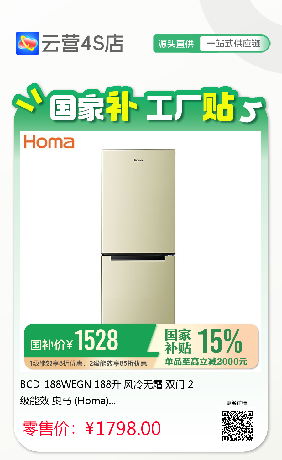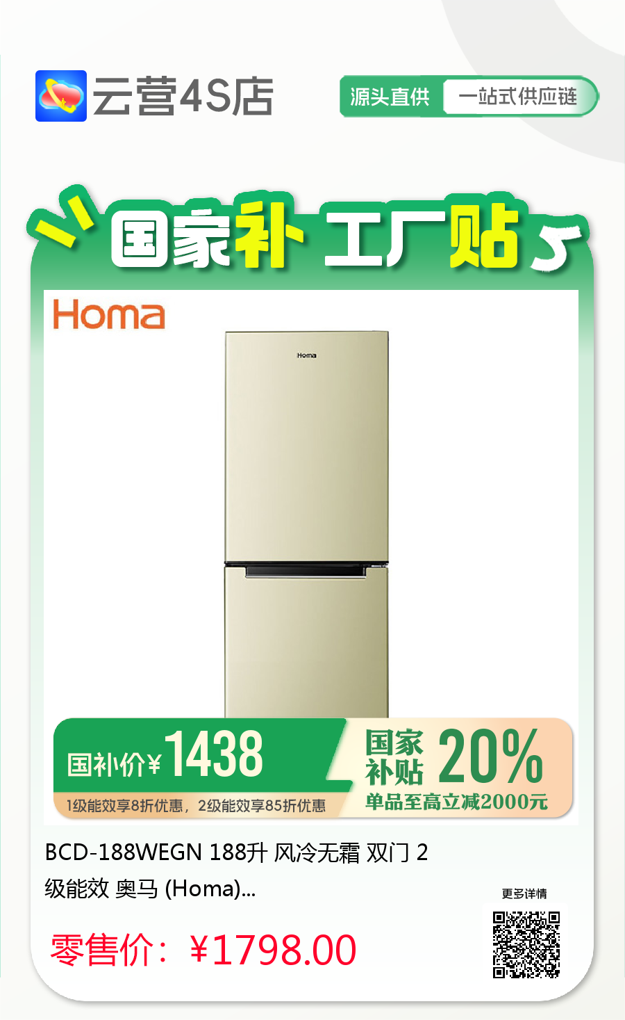 BCD-188WEGN 188升 风冷无霜 双门 2级能效 奥马 (Homa)